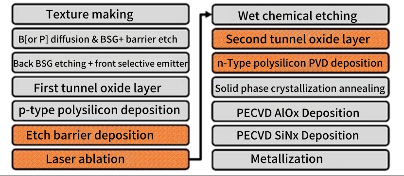 프로세스 단순화: 기존의 TOPCon 태양 전지와 비교했을 때, SABC 태양 전지는 두 가지 추가 도구(레이저 절삭 도구와 PVD 증착 도구)만 사용하므로 제조 공정이 크게 간소화됩니다.