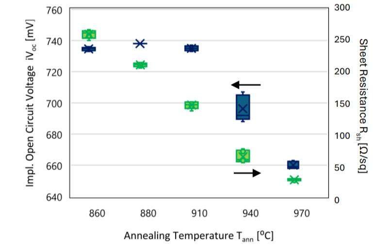낮은 온도 (<860°C)는 불충분한 도핑 활성화(Rsh 증가) 및 고온(>880)을 초래합니다.°C) 터널링 산화층의 저하(iVoc 감소)를 유발합니다.